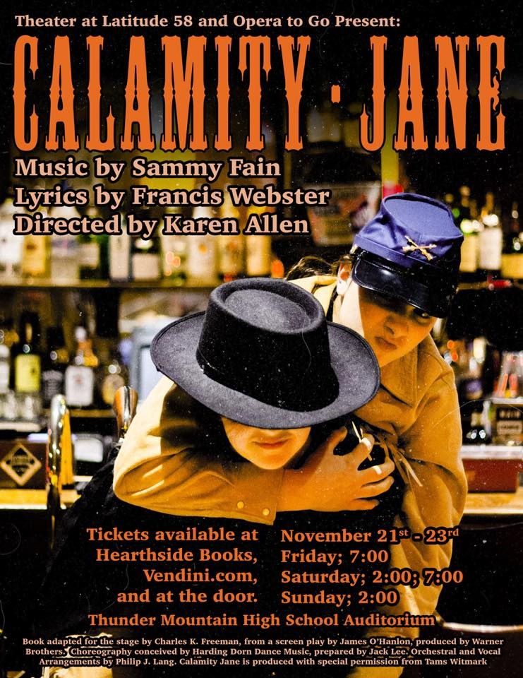 “In the wild-west outpost of Deadwood City, 1876, sharpshooting tomboy Calamity Jane carouses with cowboys, townsfolk, and her arch rival, the famous Wild Bill Hickok. After a mix-up in the talent pool at Deadwood’s saloon/theater, Calam goes to Chicago to fetch the glamorous actress Adelaid Adams, but she returns instead with Adelaid’s maid, Katie Brown. Katie turns out to be quite a performer herself, and she wins the heart of the young Lieutenant Danny Gilmartin. At the local ball, Calam briefly sheds her tomboy persona and discovers she’s in love with Wild Bill Hickok.”